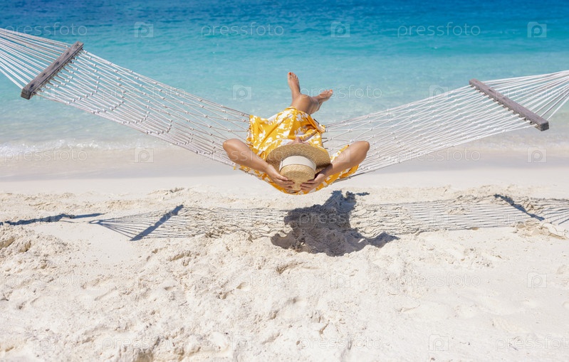Молодая женщина в соломенной шляпе и летнем платье лежит в гамаке у океана