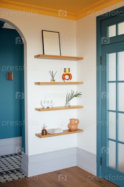 Детали стильного интерьера дома крупным планом. Деревянные полки с вазами и кувшинами ручной работы, книги и ароматические палочки. Элегантные синие деревянные двери и арочный коридор