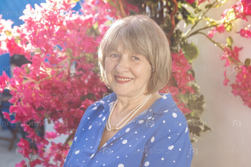 Портрет пожилой женщины в синем праздничном платье на фоне цветущего куста. Крупный план красивой улыбающейся пенсионерки