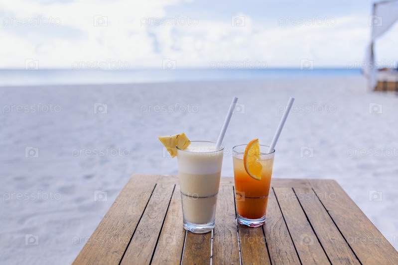 Два коктейля с кусочками фруктов на деревянном столе на пляже. Вкусные охлажденные напитки на фоне тропических деревьев и океана