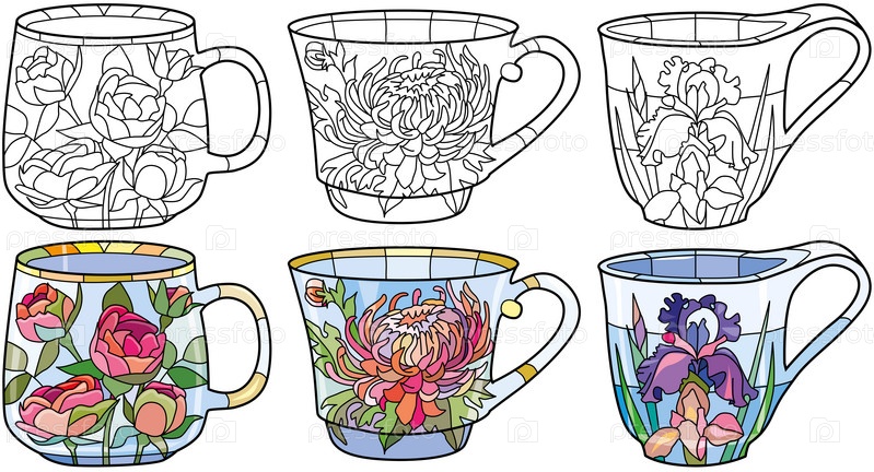 Векторные кофейные или чайные чашки с хризантемой для раскрашивания