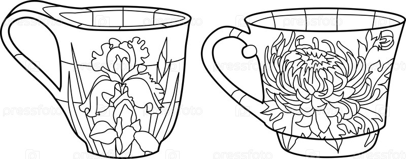 Векторные кофейные или чайные чашки с хризантемой для раскрашивания