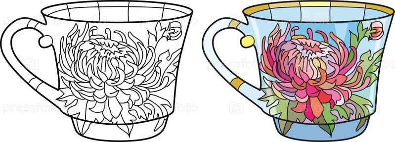 Декоративная винтажная чашка для чая. Нарисованная вручную иллюстрация для раскрашивания