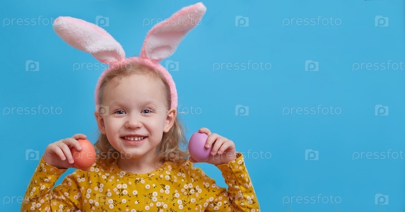 Милая счастливая маленькая девочка с ушками кролика и держит красочные пасхальные яйца перед глазами. Пасхальная открытка и концепция