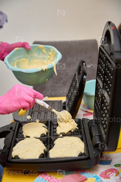 Процесс приготовления домашних бельгийских (венских) вафель. Женская рука выкладывает тесто для бельгийских (венских) вафель ложкой на разогретые панели электровафельницы. Вертикальный кадр