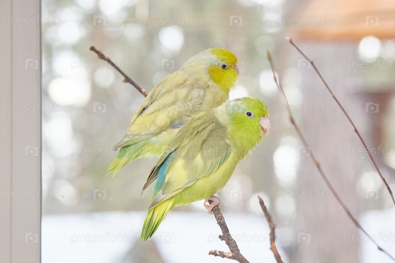 Пара попугаев-форепусов сидит на клетке и ходит по комнате. Домашние животные