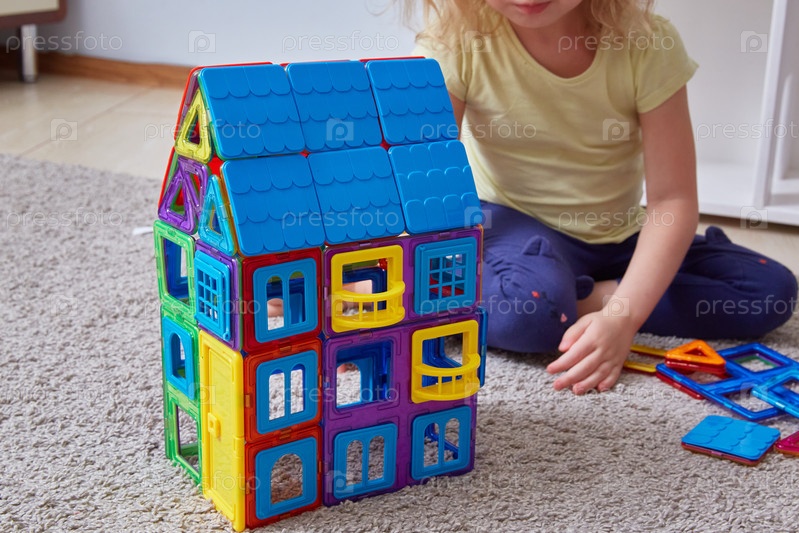 Дом сделан из магнитного конструктора. Безликий ребенок на заднем плане строит дом из конструктора
