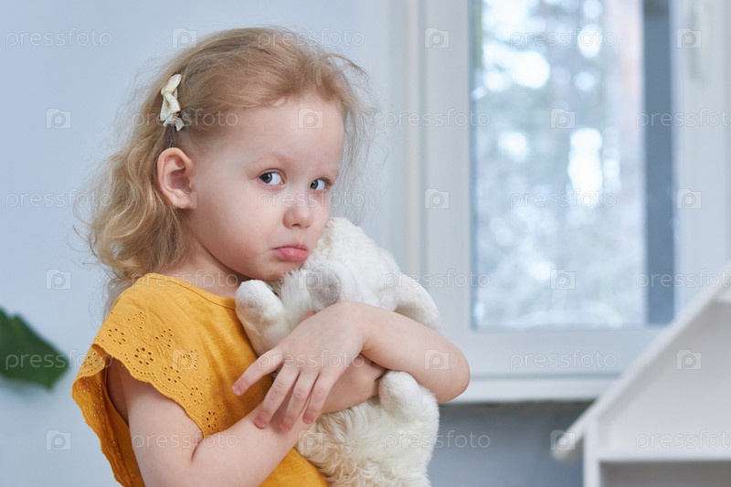Обиженная девочка обнимает белую игрушку-кролика. Копировать пространство
