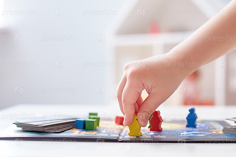 Настольная игра крупным планом. Рука ребенка перемещает фигурки в игре. Светлый фон с пространством для копирования