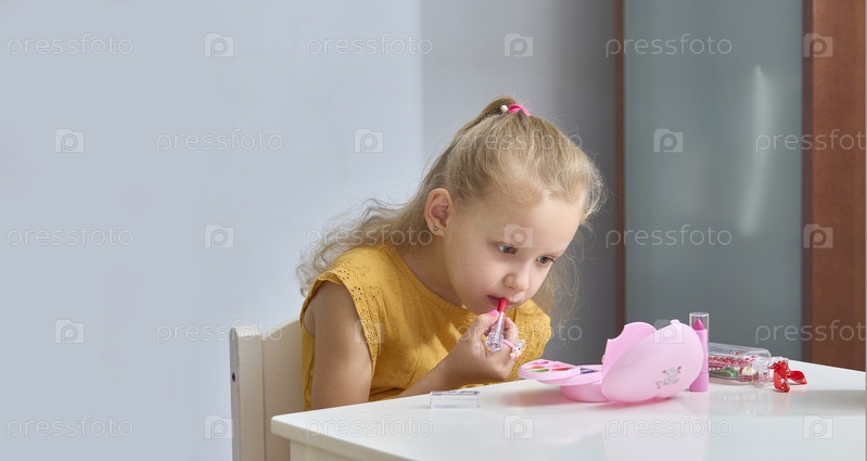 Маленькая девочка красит губы детской косметикой. Ребенок красит губы красной помадой. Дочь подражает маме