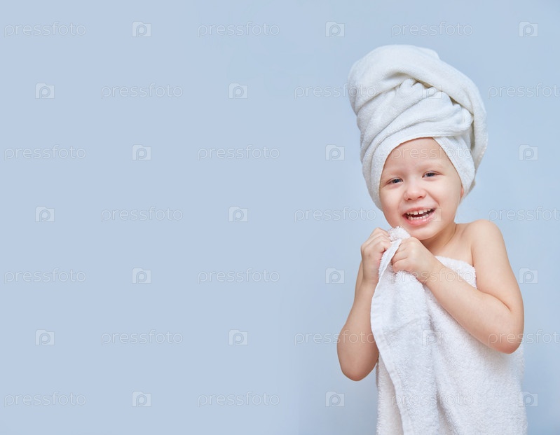 Смеющаяся девушка, одетая в белое полотенце. День спа в салоне красоты. Полотенце на голове. Дочь в спа. Концепция салона красоты. красивое лицо. Счастливый ребенок. Копировать пространство или пространство для продукта