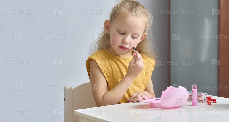 Маленькая девочка красит щеки детскими румянами. Ребенок рисует детской косметикой. Дочь подражает маме