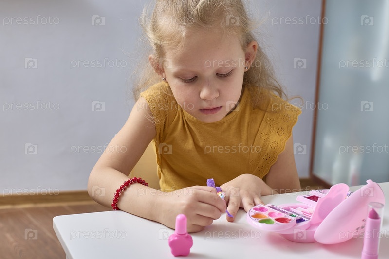 Милая маленькая девочка красит ногти, развлекаясь. Красит детские ногти. Лакирует детские ногти. Крупный план