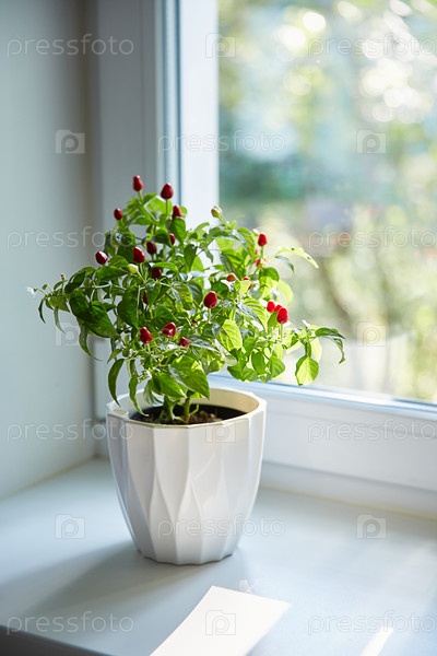 Комнатный перец на подоконнике. Домашние органические продукты на подоконнике дома. Вертикальная рамка