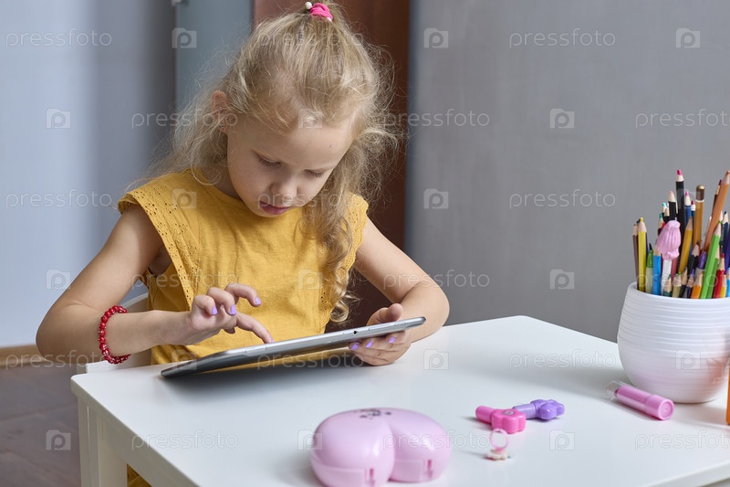 Счастливая маленькая девочка играет с планшетом. Использует гаджет для обучения и общения. Любит интересный видео- или фотоконтент в социальных сетях