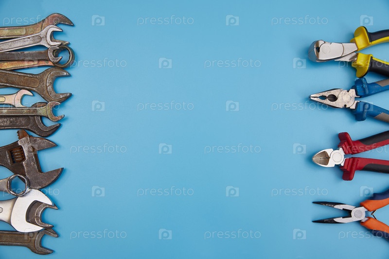 Плоскогубцы и гаечные ключи на синем фоне с местом для копирования. Вид сверху