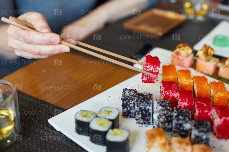 Женская рука берет японские рыбные рулетики
