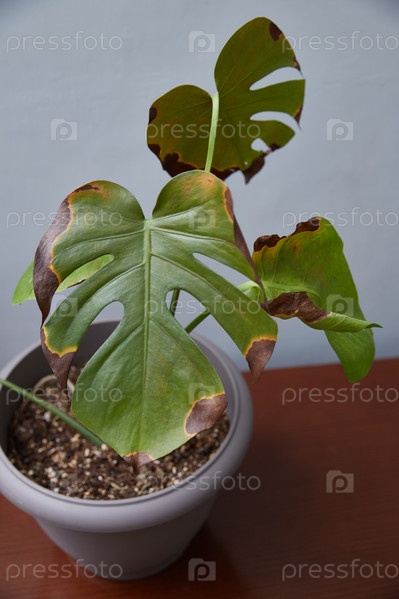 Больной лист монстеры, домашнего цветка. Вертикальная рамка