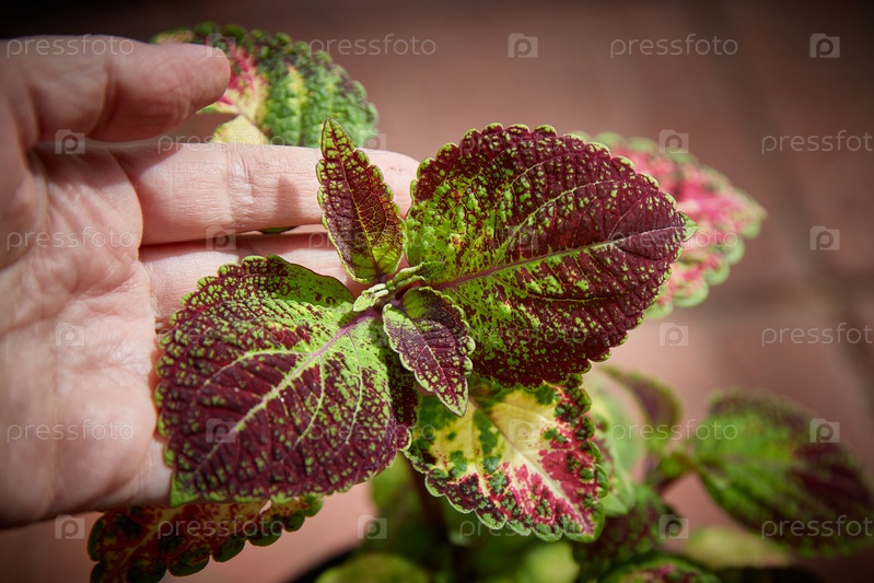 Coleus Blumei Plectranthus scutellarioides. название сорта растения Avatar Solar Shadow. листья колеуса в руке крупным планом