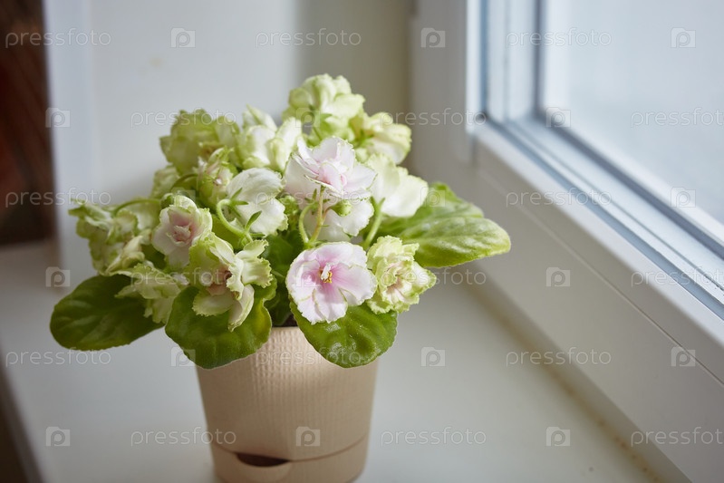 Цветок в горшке сенполии сорта Медный всадник. Обильные нежно-розовые цветы с зеленой каймой