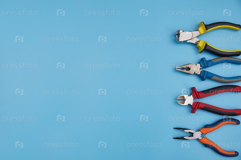 Плоскогубцы разных типов с местом для копирования на синем фоне. вид сверху