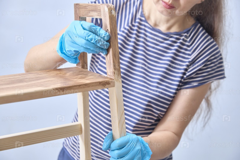 .Женщина красит деревянную полку маслом. Ремонт своими руками. Отреставрированная деревянная мебель