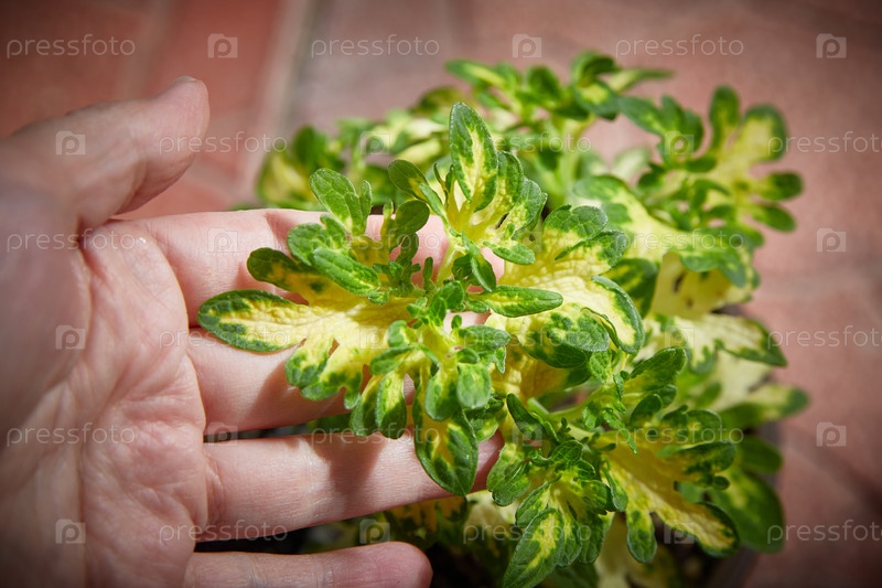 Coleus Blumei Plectranthus scutellarioides. название сорта растения Белые пальцы. листья колеуса в руке крупным планом