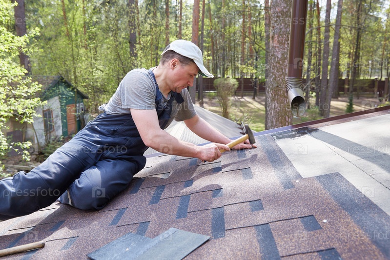 Мужчина монтирует мягкую битумную черепицу с помощью гвоздей и молотка на крыше загородного дома