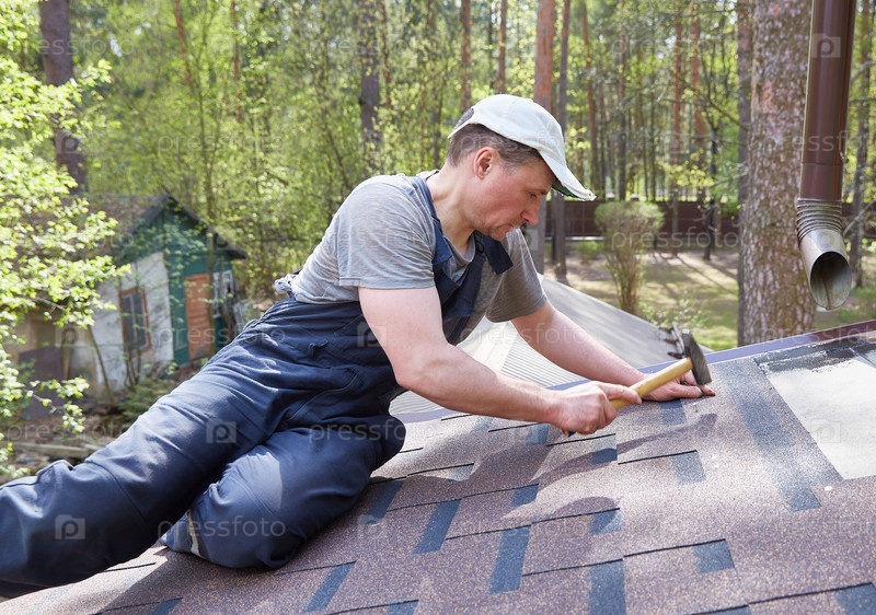 Мужчина монтирует мягкую битумную черепицу с помощью гвоздей и молотка на крыше загородного дома