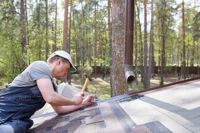 Мастер монтирует мягкую черепичную кровлю на крышу загородного дома