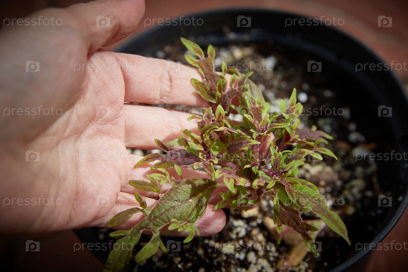 Coleus Blumei Plectranthus scutellarioides. название сорта растения Langostino. листья колеуса в руке крупным планом