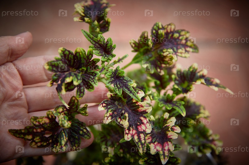 Coleus Blumei Plectranthus scutellarioides. название сорта растения Gilda. листья колеуса в руке крупным планом