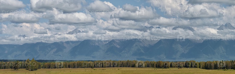 Россия. Республика Бурятия. Живописные вид на пики горного хребта Восточного Саяна тонущего в тумане и кучевых облаках из долины реки Иркут