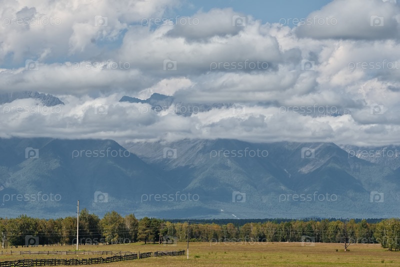 Россия. Республика Бурятия. Живописные вид на пики горного хребта Восточного Саяна тонущего в тумане и кучевых облаках из долины реки Иркут