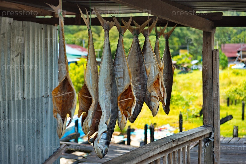 Малайзия. Сандакан. Морская рыба рода скумбриевых сушится на веревке - типичный способ заготовки морских рыб впрок на острове Борнео