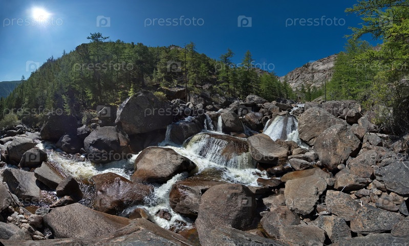 Россия, Западная Бурятия, Восточные Саяны. Живописная панорама горной реке Дабата несущаяся с гор под углом 45 градусов бесчисленными каскадами среди огромных валунов