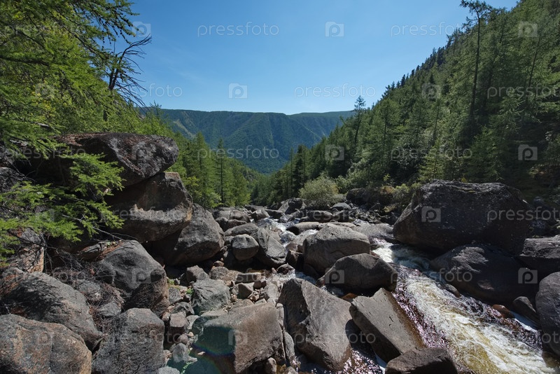 Россия, Западная Бурятия, Восточные Саяны. Живописная панорама горной реке Дабата несущаяся с гор под углом 45 градусов бесчисленными каскадами среди огромных валунов