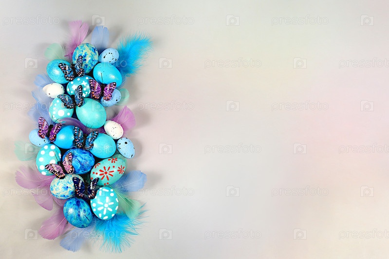 Концепция счастливой Пасхи. Абстрактная весенняя пасхальная композиция с синими крашеными яйцами, перьями, бабочками, цветущими ветвями и цветами. Баннер для экрана с местом для поздравительного текста