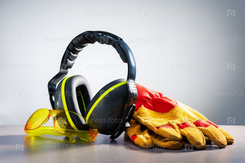 Средства индивидуальной защиты. Наушники, защитные перчатки, очки на серой поверхности