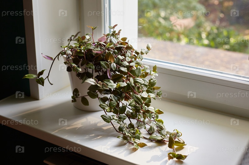 Традесканция в высоком белом кашпо на окне в солнечный день