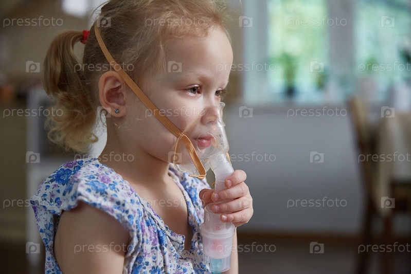 Больная маленькая девочка делает ингаляцию с помощью небулайзера, чтобы уменьшить кашель. Лечение бронхита и астмы у детей