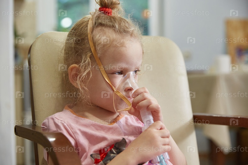Больная девочка дышит ингалятором-небулайзером дома во время болезни. Образ жизни