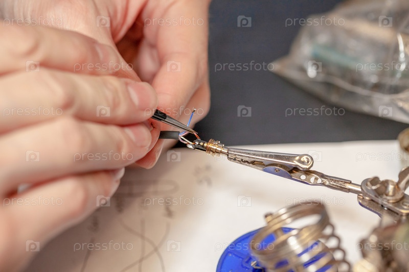 Электрик ремонтирует электрический компонент, на столе с устройством и инструментами, крупный план, размытый фон