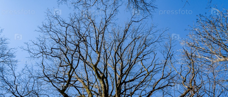 Ветви старых дубов, вид снизу, на фоне голубого неба