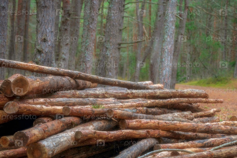 Распиленные стволы деревьев лежат в лесу