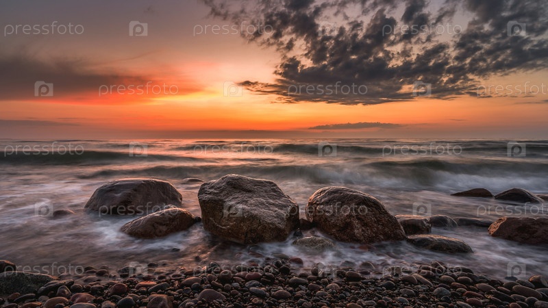Красочный закат над морем и скалистым берегом