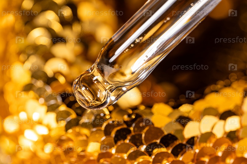 Красота лица масло капает из пипетки на фоне золотых блесток. Реклама косметики по уходу за кожей с копировальным пространством