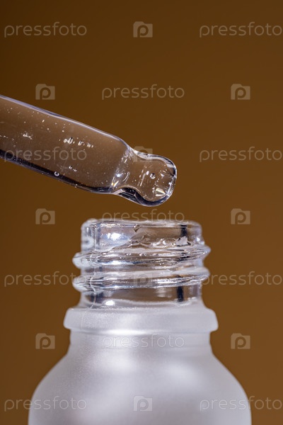 Прозрачная бутылка с сывороткой красоты, гиалуроновой кислотой, гиалуроновой кислотой и витаминами на бежевом фоне. Концепция ухода за лицом и телом класса люкс