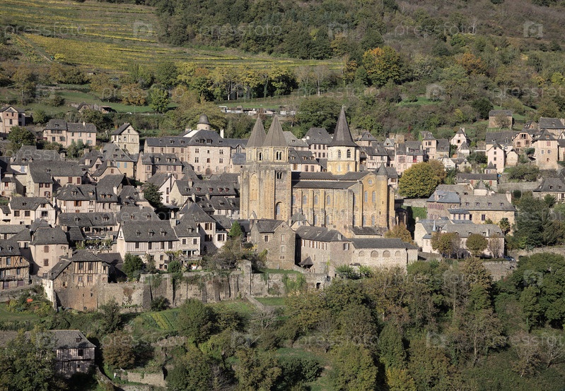В Конке, Франция, средневековые здания возвышаются среди пышной зелени под ясным голубым небом