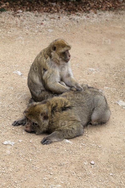 Два берберских макака лизают друг друга в парке Monkey Forest во Франции, демонстрируя свое социальное взаимодействие